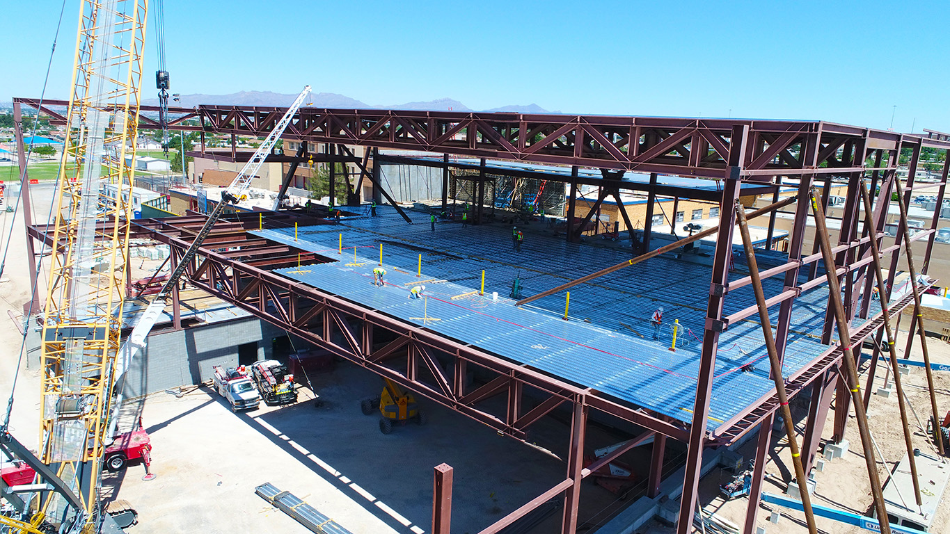 We delivered comprehensive erection engineering services for a multi-level arts and sports complex at Bel Air High School, designed for the Ysleta Independent School District to replace the previous single-level gym on the same constrained site. The 98,000 sq. ft. facility features an innovative, stacked two-story design that accommodates two clear-span athletic spaces within a landlocked campus, bordered by existing buildings, an active highway, and limited access via a single residential street.